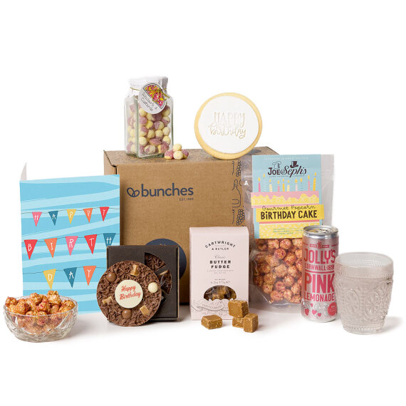 Celebrate in style with this delightful birthday hamper packed with premium treats and sweet surprises for the special day. Send birthday wishes with this charming collection of chocolates, confectionery, and refreshing lemonade to make them smile. Delivered with a premium A5 ‘Happy Birthday’ greetings card with your personal message printed inside. This hamper contains 6 items: Jolly’s Cornwall Pink Lemonade 250ml Birthday Shortbread Biscuit Happy Birthday Chocolate Pizza 70g Bramble Foods Rhubarb & Custard 185g Cartwright & Butler Butter Fudge 175g Joe & Seph’s Gourmet Birthday Cake Popcorn 70g Delivered in a postal gift box.