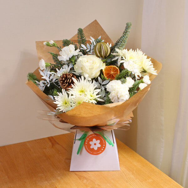 A magnificent handcrafted alternative to traditional seasonal flowers, our Snowy Day Gift box features Carnation, Chrysanthemum and Roses in simple, classic whites and greens. These hand cut flowers are ethically sourced, sustainable and make a great Christmas gift.
