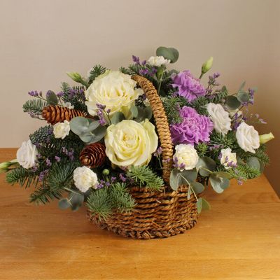 The cream and ivory flowers complement the ruffled purple blooms like the sky on a winter’s night-a beautiful combination of flowers that comes in a basket and is ready to display.